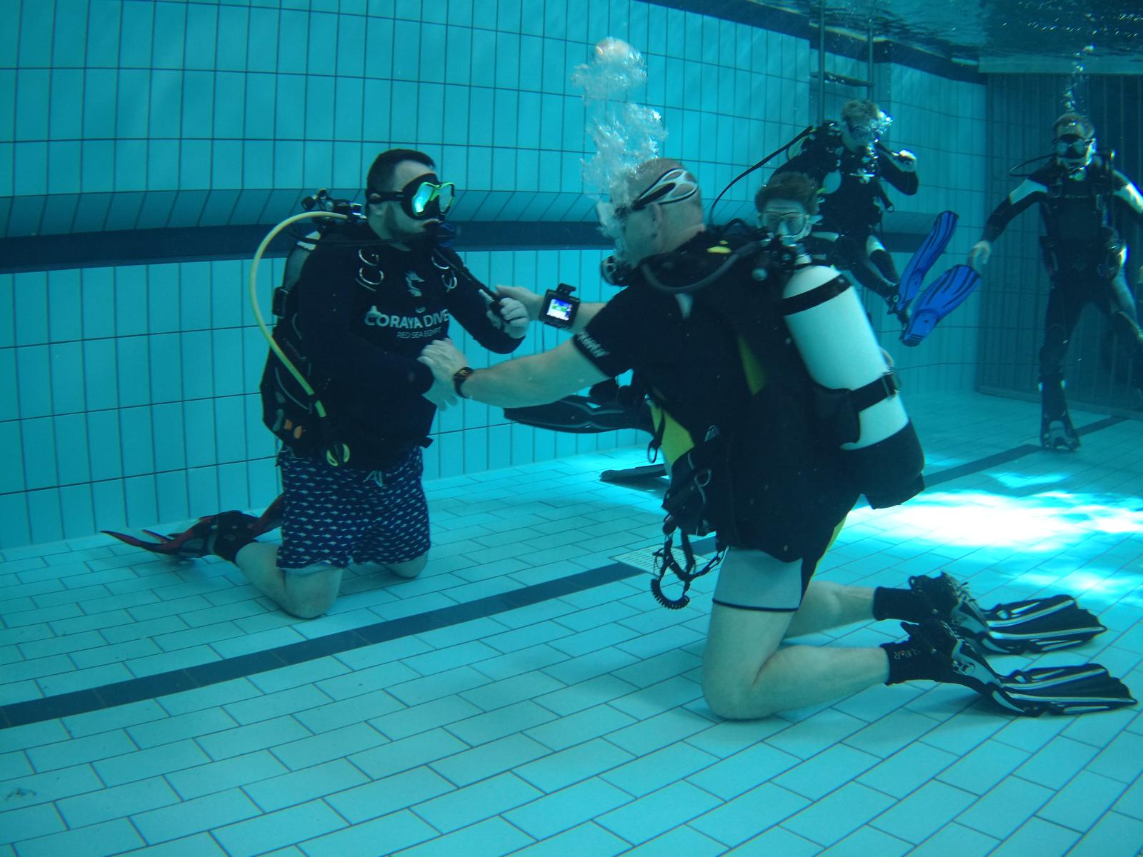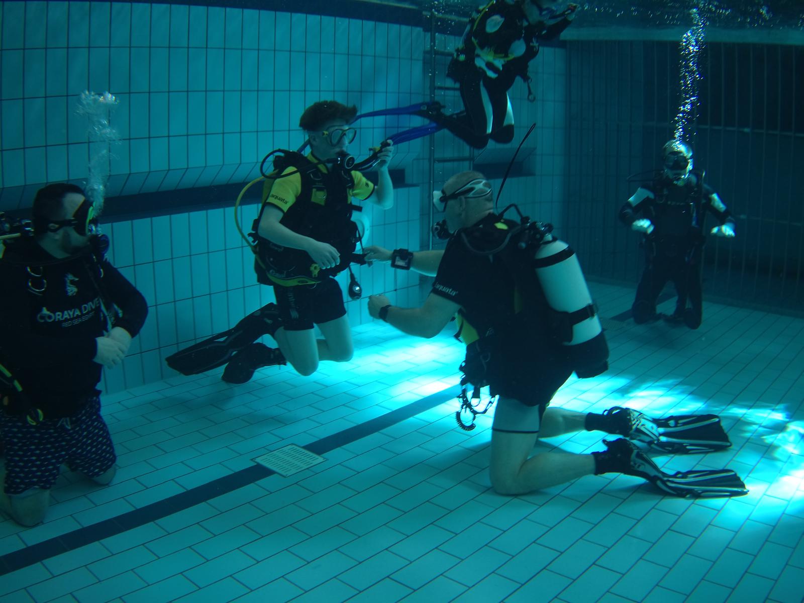Diese Übungen stärken nicht nur das Vertrauen innerhalb des Teams, sondern erhöhen die Sicherheit bei späteren Tauchgängen im Freiwasser.